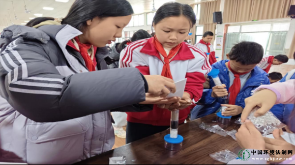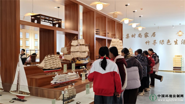 五里牌镇中心小学学生合作组装净水实验装置。 实地研学见行见效 研学首站,宣讲团成员带领五里牌镇中心小学师生走进省级绿色园区双牌县竹木产业科技园,零距离感受“以竹代塑”产业发展。学生有序穿梭于展厅与车间之间,亲眼见证了一根根原生翠竹如何经过现代工艺,蜕变为环保餐具、全竹家具等40余类创新产品。“这些精致帆船,真的卖到了国外吗?”当听到工作人员介绍工艺品远销全球30多个国家和地区时,孩子们眼中充满了惊喜与自豪。这场沉浸式的参观,不仅展示了双牌将本土竹木资源转化为绿色产业的完整链条,更让一场生态文明教育在行走的课堂中落地生根,生态保护与经济发展的“双赢实践”变得可知可感。